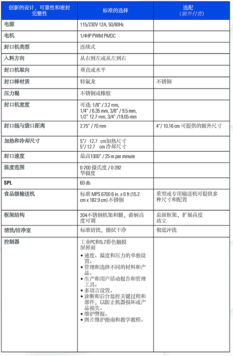 因为您的袋密封需求是独特的,MPS 6300和6700是定制的众多用户可选择的规格和一个全面的功能集。在没有额外的费用,您可以配置您的袋封口机的进给方向,封口机方向,封口宽度,压力辊的类型,和电力供应。附加的可定制选项和设备附加组件可提供具有竞争力的价格。常见的升级包括压缩带,以消除周围的空气和喷墨打印机。传奇Plexpack质量和性能内置在每个组件,以确保一致,精确的操作和可靠性24/7。Emplex连续带封口机提供行业领先的密封完整性,几乎任何热密封软,高密度特种薄膜用于医疗和制药行业。